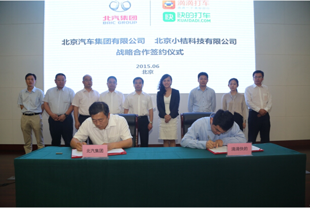 6月4日,北京汽車集團有限公司與北京小桔科技有限公司(滴滴快的)簽訂戰略合作協議。北汽集團攜手“互聯網+”又出新成果。
